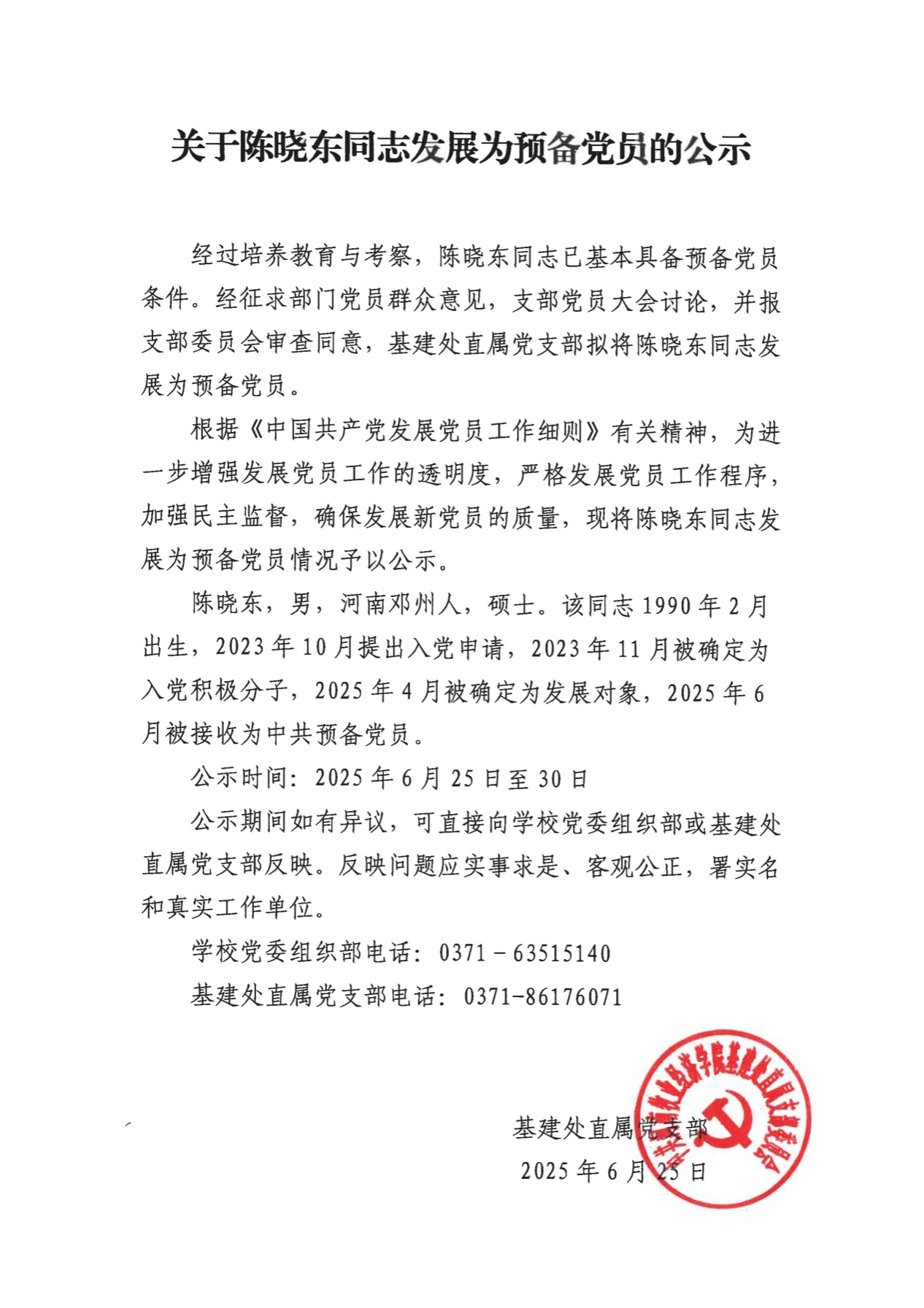mansion88明升关于陈晓东同志发展为预备党员的公示